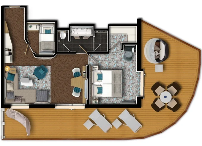 | SKTO - Themen Suite 54 m² + balkon 15 m² se stolem, lehátkom a houpací sítí. Ložnice, Obývací část, šatník. 10. paluba. Max 4 osoby. Výhody Suite. | 510 833 Kč 170 278 Kč za osobu | ||