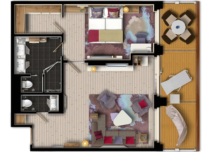 | SUTO - Themen Suite 54 m² + balkon 15 m² se stolem, lehátkom a houpací sítí. Ložnice, Obývací část, šatník. 10. paluba. Max 4 osoby. Výhody Suite. | 465 778 Kč 465 778 Kč za osobu | ||