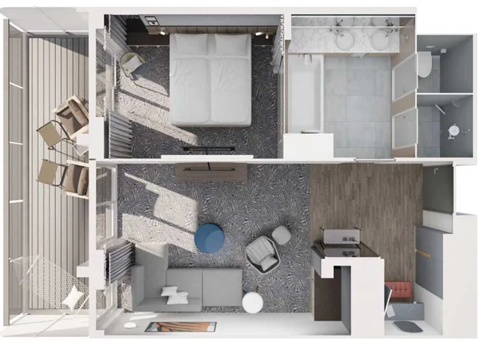 | JKCO - Junior Suite s balkonem C 26 m² + balkon 7 m² se židlemi a podnožkami. 7. paluba. Max 4 osoby. Výhody Junior Suite. | 265 372 Kč 66 343 Kč za osobu | ||