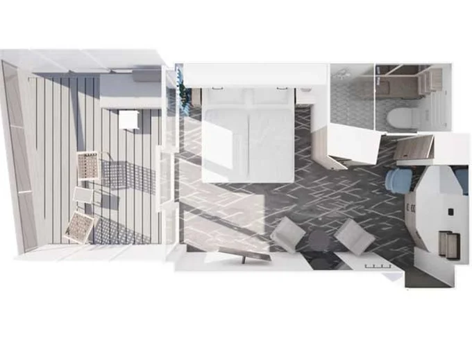 | VKKO - Kajuta s terasou 20 m² + balkon 13 m² se židlemi a váľandou. 15. paluba. Max 2 osoby. | 177 265 Kč 177 265 Kč za osobu |
