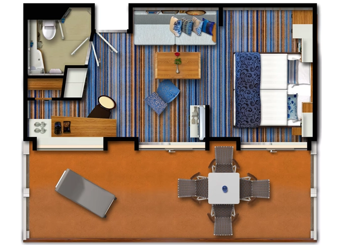| SUDO - Diamant Suite 42 m² + balkon 47 m² se stolem se 4 židlemi, s houpací sítí, 2 lehátky a postelí Sun island. 2 ložnice, obývací pokoj, Herní konzole. 6. paluba. Max 6 osoby. Výhody Suite. | 471 087 Kč 471 087 Kč za osobu |