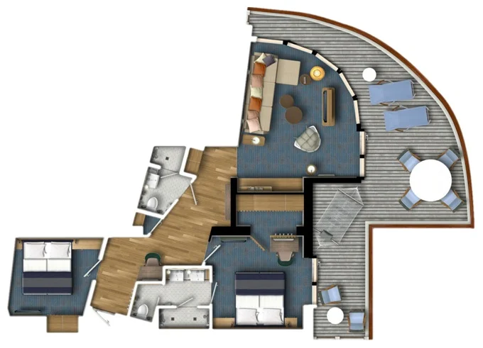 | SPNO - Panorama Suite 73-77 m² + balkon 31-36 m² se stolem, lehátky a houpací sítí. 2 ložnice a 2 koupelny. 6,9,10. paluba. Max 6 osoby. Výhody Suite. | 320 520 Kč 160 260 Kč za osobu | ||